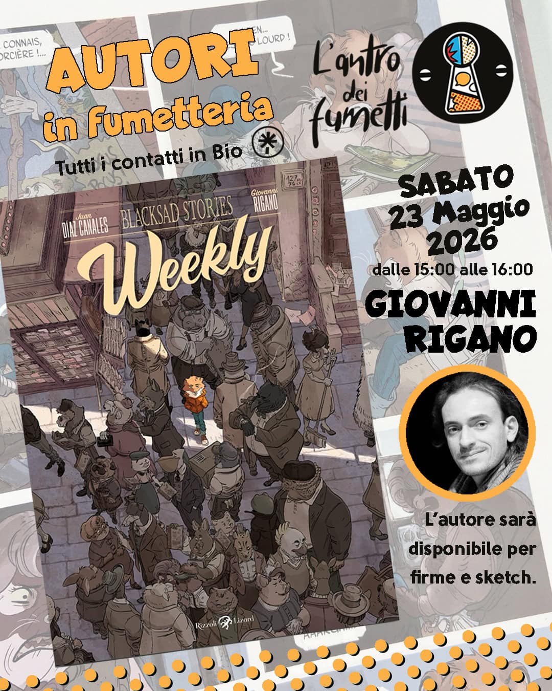 L’arrivo di Blacksad Stories: Weekly è esattamente uno di quei momenti! E non solo perché si tratta di un titolo che amplia l’universo narrativo di uno dei noir più amati degli ultimi vent’anni, di cui sono una grande fan, ma perché questa volta c’è un motivo in più per festeggiare: Giovanni Rigano, l’illustratore dell’opera, sarà ospite in libreria il 23 maggio!