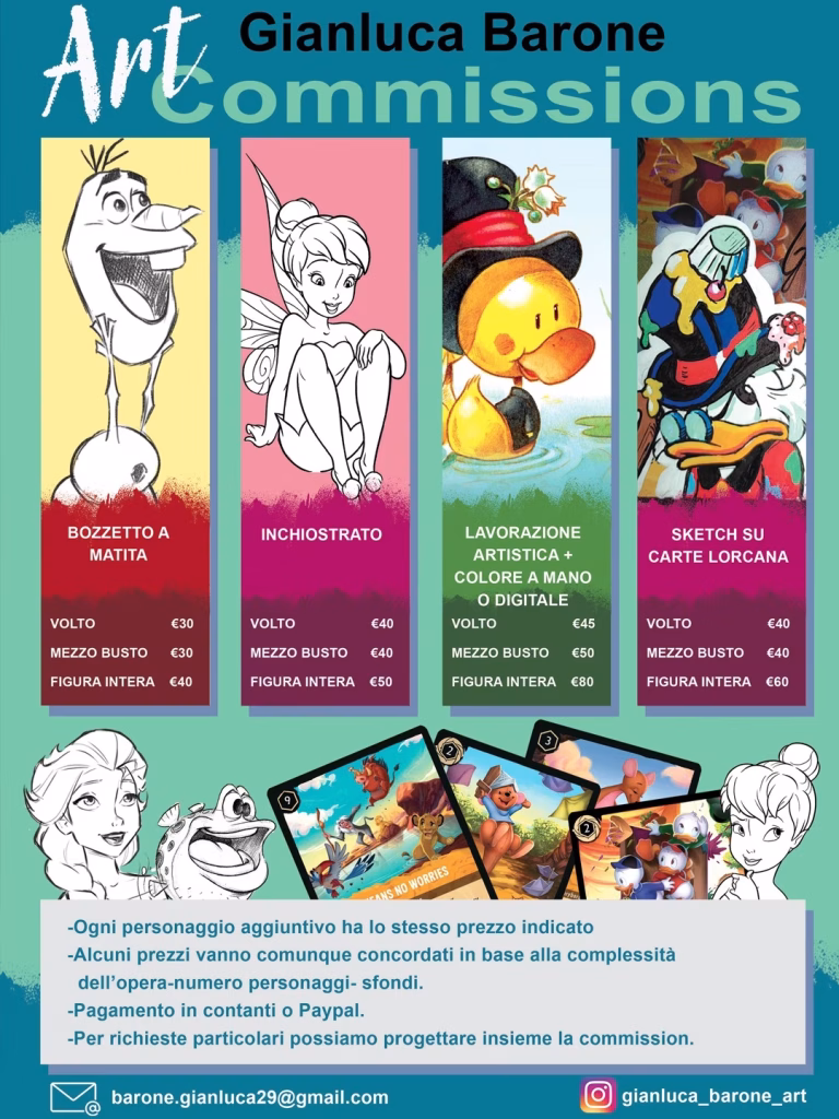 Classe 1974, Gianluca ha iniziato la sua carriera creando storyboards e packaging iconici, per poi entrare nella Disney Academy e realizzare albi illustrati e fumetti tratti dai vostri titoli preferiti: da Toy Story a Frozen, da Cars a Raya! Attualmente collabora anche con Ravensburger per Lorcana TCG. 🧑🏻🎨 Per Commissions: Scrivi direttamente a Gianluca via mail !